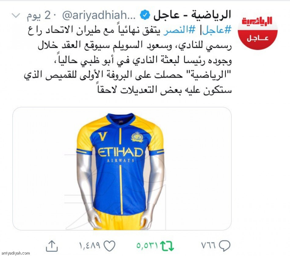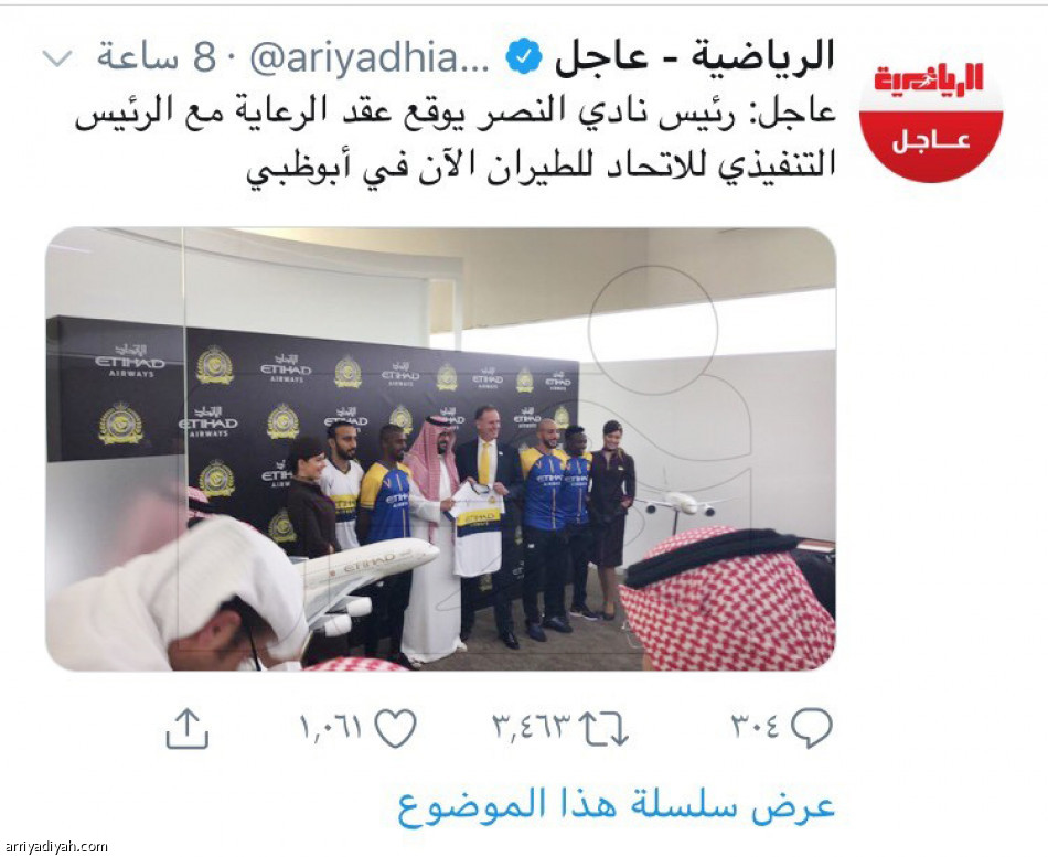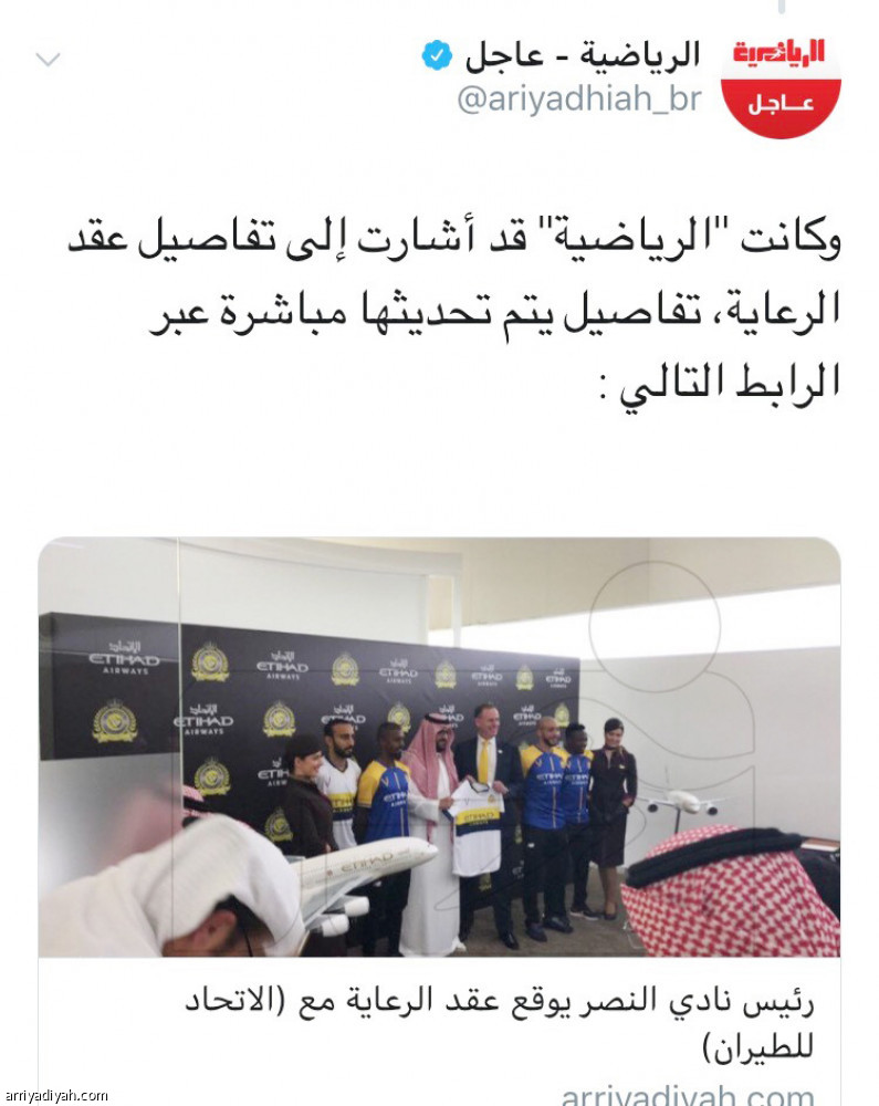 وكان حساب "الرياضية عاجل" أعلن قبل يومين عن اتفاق نهائي بين النصر وشركة طيران الاتحاد وأنه سيتم توقيع العقد في الإمارات بوجود سعود السويلم رئيس النادي العاصمي.